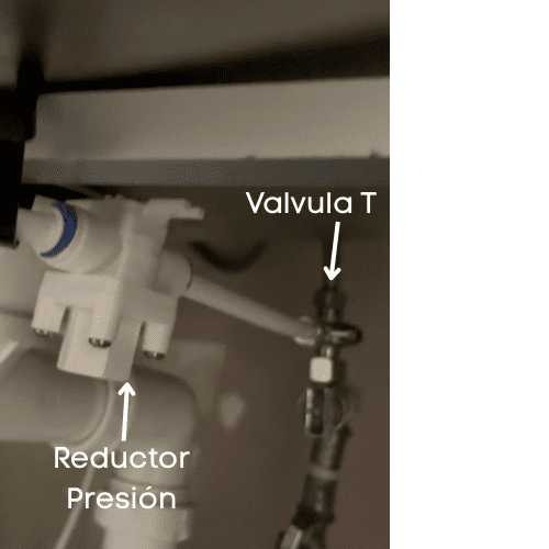 Conecta el tubo de 3/8 desde la salida de la vávula «t» a la entrada del Reductor de Presión.- Mide el tubo necesario que va de la salida del reductor de presion al eSpring. Ten en cuenta que puedes necesitar sacar el sistema de purificación para limpieza o tareas de mantenimiento, por lo que debes dejar tubo suficiente para manipularlo.